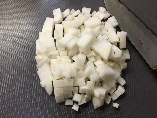 • はじめに、リンゴのヘタがついていない方を使っていきます。